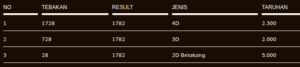 | Rumus Angka Mati berdasarkan kepala harian | 04 05 06 07 09 10 15 17 18 20 21 29 30 31 32 41 42 43 53 54 61 62 64 65 72 73 75 82 83 84 85 86 87 93 94 95 96 97 98 |
