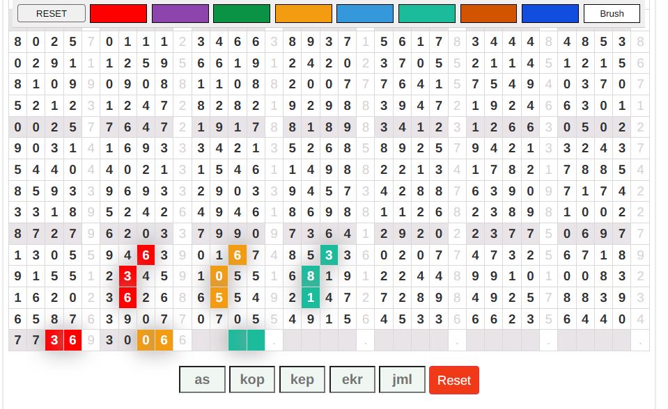 | Rumus Angka Mati berdasarkan kepala harian | 04 05 06 07 08 09 10 15 16 17 18 19 21 26 27 28 29 30 32 37 39 41 42 43 52 53 54 63 64 65 75 76 83 84 86 87 94 95 97 |