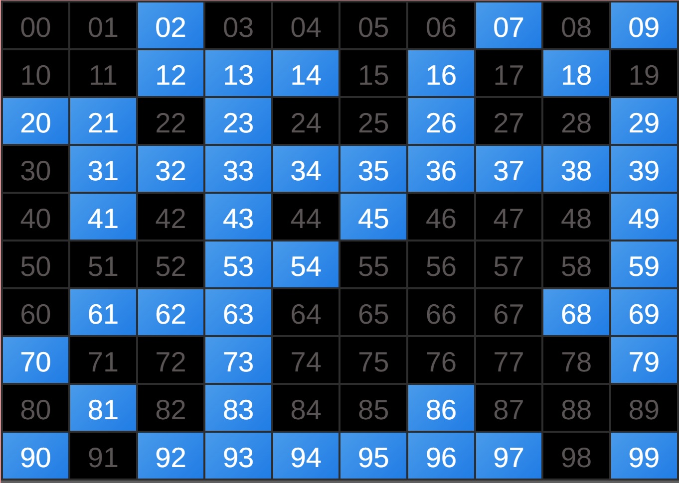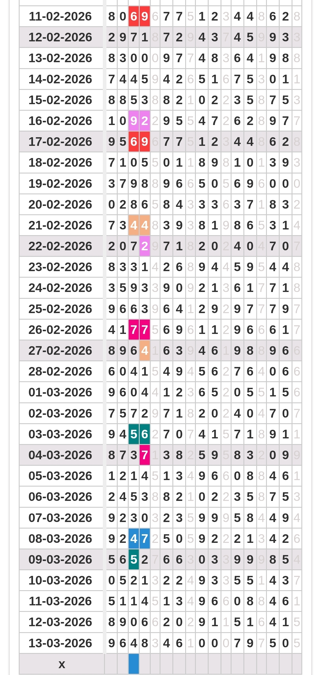 | Rumus Angka Mati berdasarkan kepala harian | 07 08 09 10 19 20 21 27 28 31 38 39 40 41 42 43 48 49 50 51 52 53 54 59 60 61 62 63 65 71 73 74 76 85 86 87 96 97 98 |