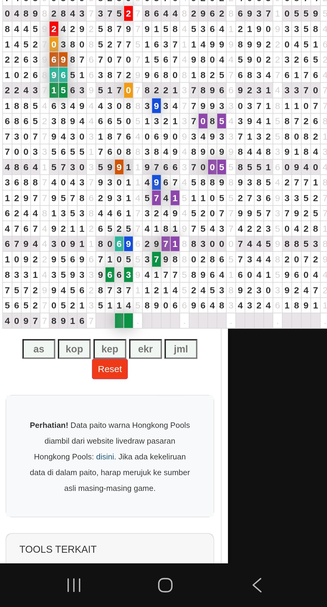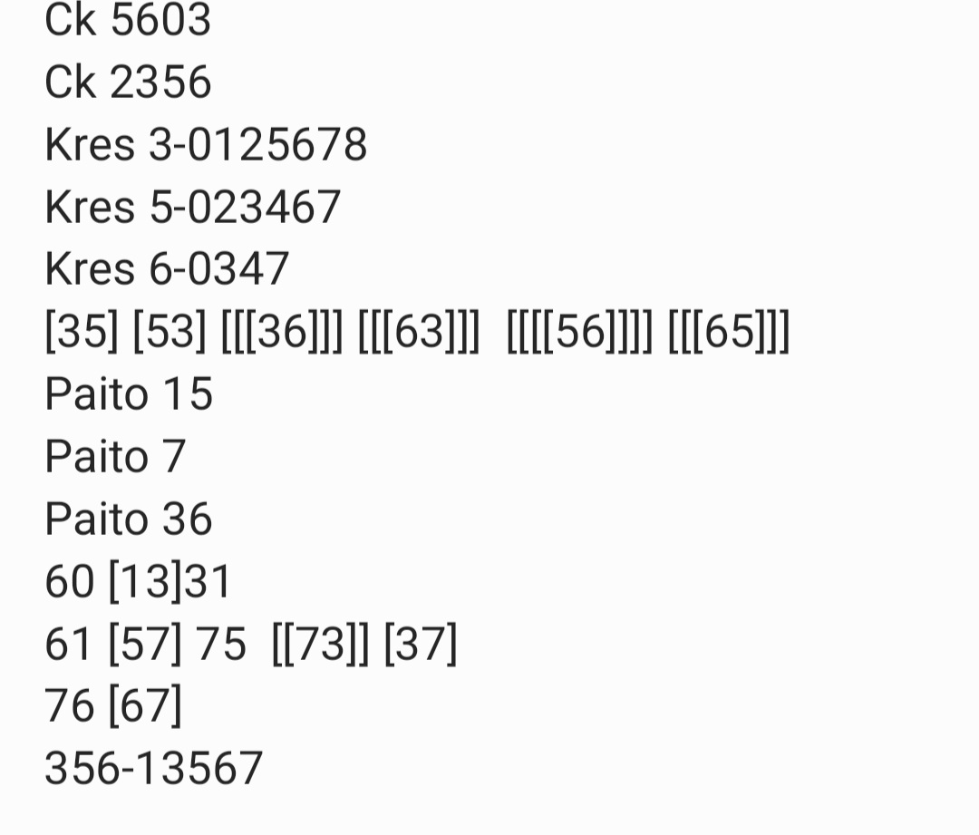 | Rumus Angka Mati berdasarkan kepala harian | 04 05 06 07 09 10 15 17 18 20 21 29 30 31 32 41 42 43 53 54 61 62 64 65 72 73 75 82 83 84 85 86 87 93 94 95 96 97 98 |
