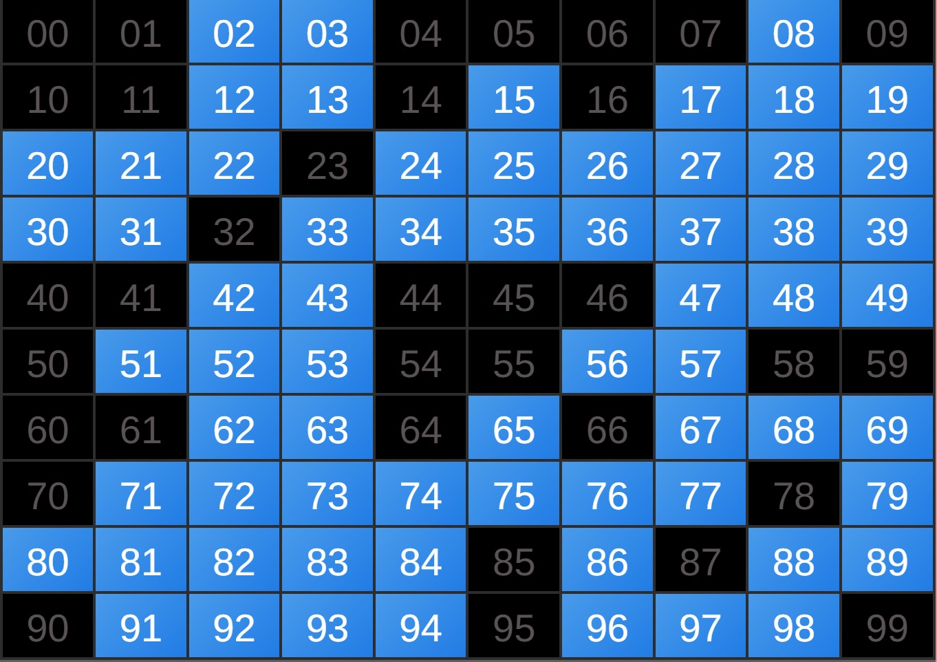 | Rumus Angka Mati berdasarkan kepala harian | 04 05 06 07 09 10 15 17 18 20 21 29 30 31 32 41 42 43 53 54 61 62 64 65 72 73 75 82 83 84 85 86 87 93 94 95 96 97 98 |