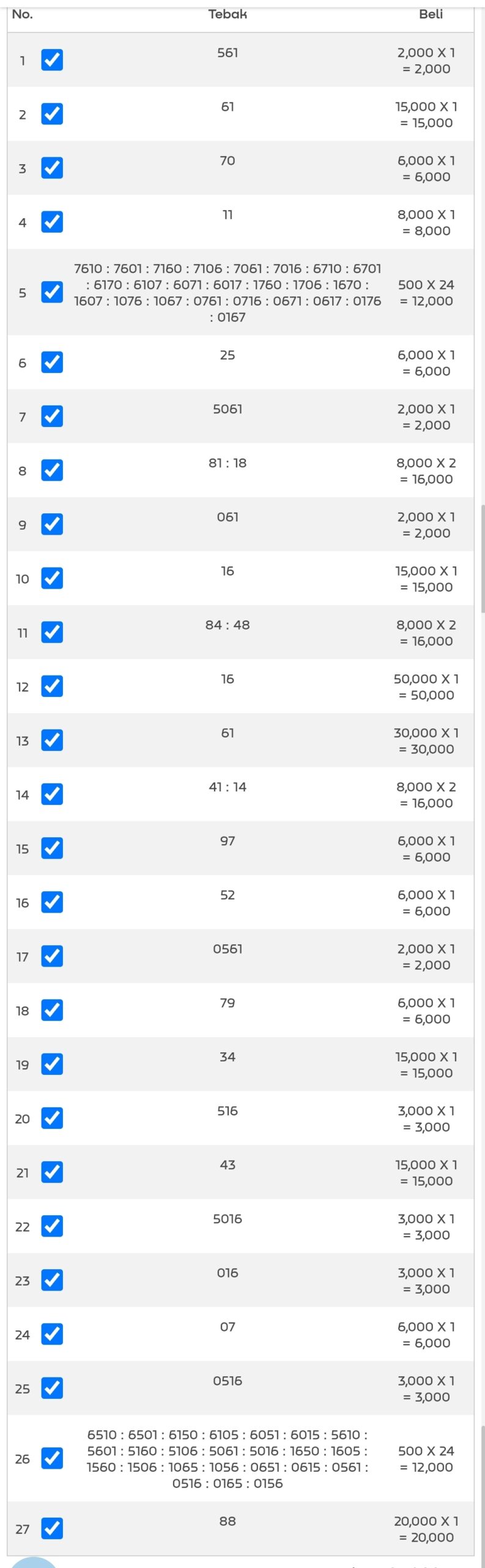 | Rumus Kontrol 1 berdasarkan As harian | 1567890 2345678 1234590 0124589 |