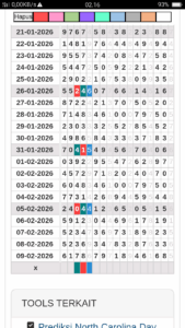 Prediksi North Carolina Day Jumat, 16-01-2026 Merupakan Prediksi Otomatis yang menggabungkan Metode Kalender Togel Dengan LN Generator yang akurasi prediksinya sudah kita ketahui bersama. Jadi harap Maklum Jika kadang meleset Prediksi North Carolina Day kita. Jadikan ini sebagai perbandingan saja dan tetap Utamakan karya sendiri