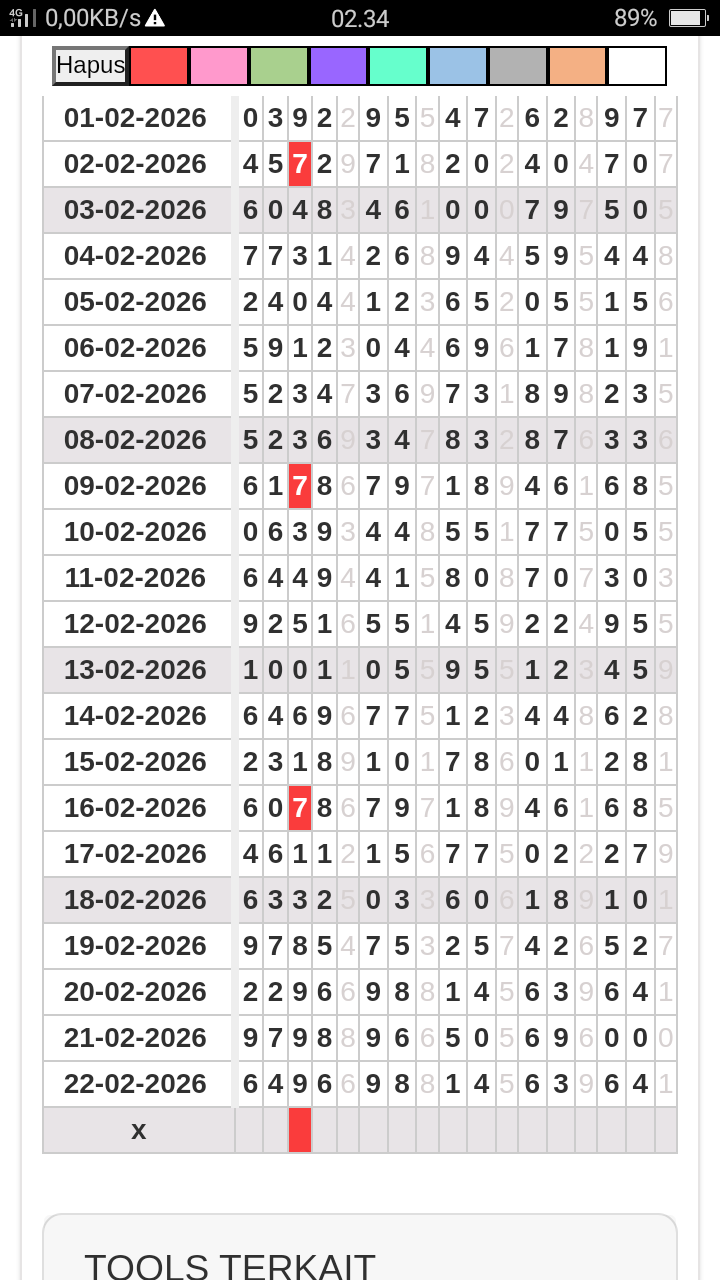 | Rumus Angka Mati berdasarkan kepala harian | 04 05 06 07 09 10 15 17 18 20 21 29 30 31 32 41 42 43 53 54 61 62 64 65 72 73 75 82 83 84 85 86 87 93 94 95 96 97 98 |