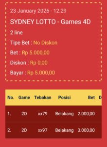 Prediksi Sydney Lotto Kamis, 29-01-2026 Merupakan Prediksi Otomatis yang menggabungkan Metode Kalender Togel Dengan LN Generator yang akurasi prediksinya sudah kita ketahui bersama. Jadi harap Maklum Jika kadang meleset Prediksi Sydney Lotto kita. Jadikan ini sebagai perbandingan saja dan tetap Utamakan karya sendiri