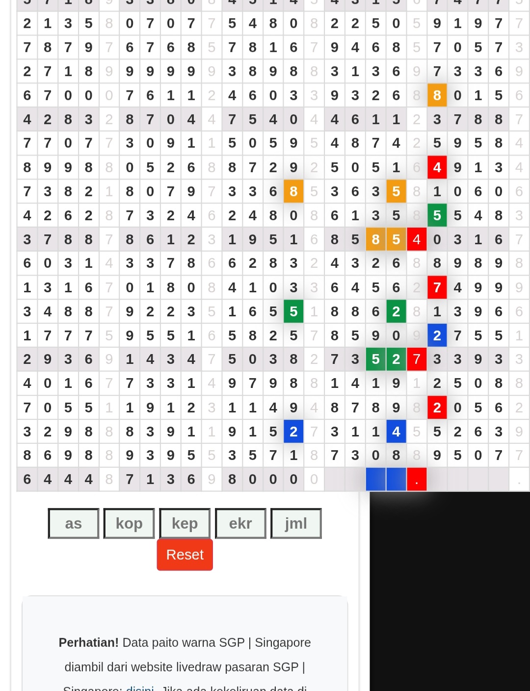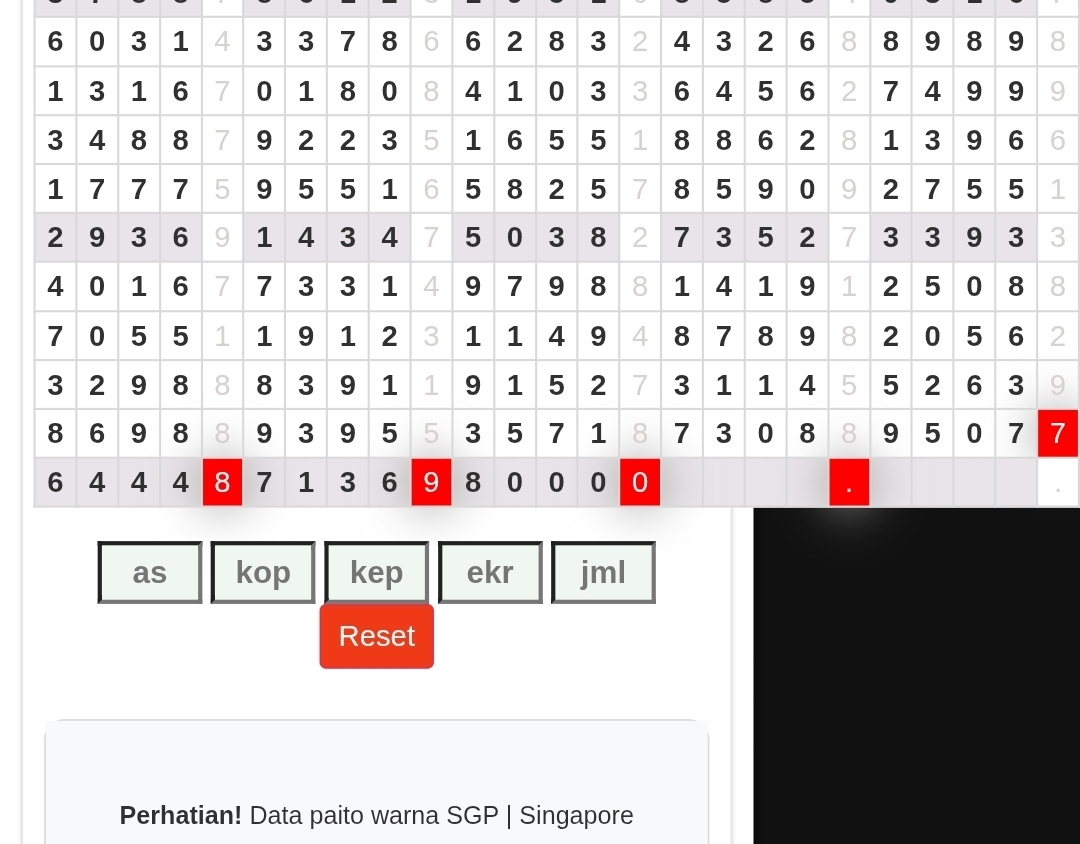 | Rumus Angka Mati berdasarkan kepala harian | 04 05 06 07 08 09 10 15 16 17 18 21 26 28 29 30 31 32 41 42 43 52 53 54 64 65 72 73 75 76 83 84 86 93 94 95 96 97 98 |