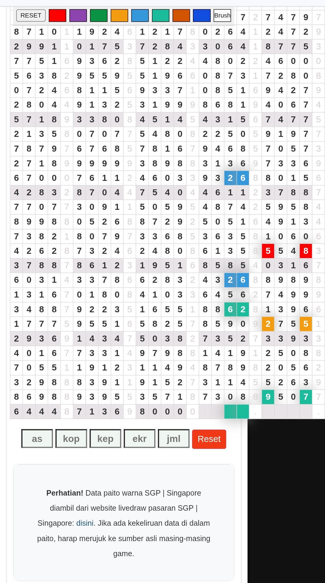 | Rumus Angka Mati berdasarkan kepala harian | 04 05 06 07 08 09 10 15 16 17 18 21 26 28 29 30 31 32 41 42 43 52 53 54 64 65 72 73 75 76 83 84 86 93 94 95 96 97 98 |