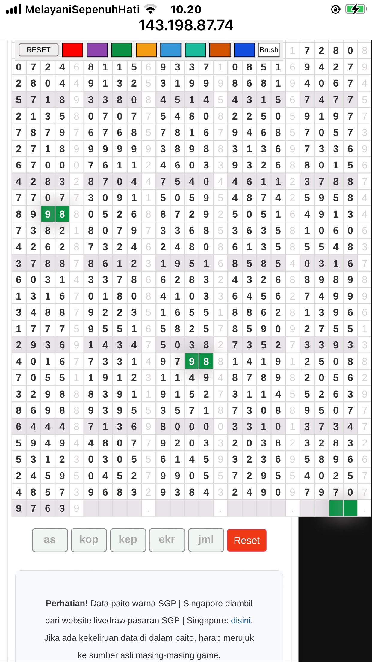 | Rumus Angka Mati berdasarkan kepala harian | 04 05 06 07 08 09 10 15 16 17 18 19 21 26 27 28 29 30 32 37 39 41 42 43 52 53 54 63 64 65 75 76 83 84 86 87 94 95 97 |