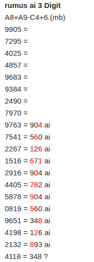 | Rumus Angka Mati berdasarkan kepala harian | 08 09 10 16 17 19 20 27 28 30 31 32 37 38 39 40 41 42 43 48 49 50 51 52 54 59 60 62 63 65 74 75 76 85 86 87 96 97 98 |