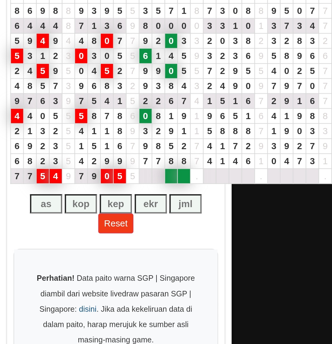 | Rumus Angka Mati berdasarkan kepala harian | 07 08 09 10 18 19 20 21 29 31 32 40 42 43 49 50 51 53 60 61 62 63 64 65 71 72 73 74 75 76 82 83 84 85 87 93 95 96 98 |
