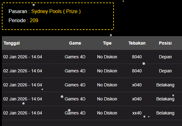 Prediksi Sydneypools Sabtu, 31-01-2026 Merupakan Prediksi Otomatis yang menggabungkan Metode Kalender Togel Dengan LN Generator yang akurasi prediksinya sudah kita ketahui bersama. Jadi harap Maklum Jika kadang meleset Prediksi Sydneypools kita. Jadikan ini sebagai perbandingan saja dan tetap Utamakan karya sendiri