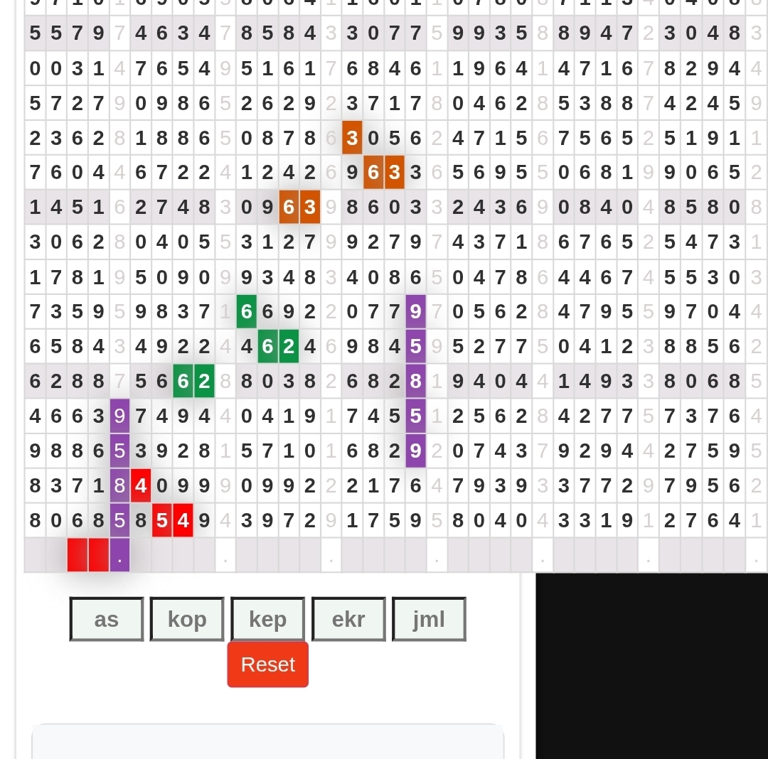 | Rumus Angka Mati berdasarkan kepala harian | 04 05 06 07 09 10 15 17 18 20 21 29 30 31 32 41 42 43 53 54 61 62 64 65 72 73 75 82 83 84 85 86 87 93 94 95 96 97 98 |