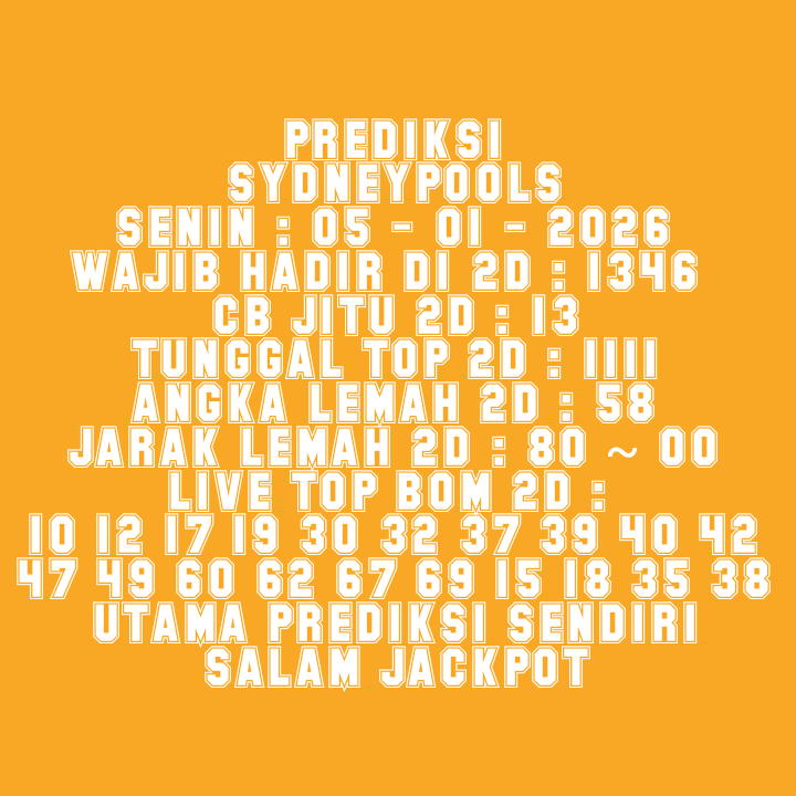 Prediksi Sydneypools Jumat, 30-01-2026 Merupakan Prediksi Otomatis yang menggabungkan Metode Kalender Togel Dengan LN Generator yang akurasi prediksinya sudah kita ketahui bersama. Jadi harap Maklum Jika kadang meleset Prediksi Sydneypools kita. Jadikan ini sebagai perbandingan saja dan tetap Utamakan karya sendiri