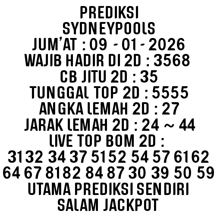 Prediksi Sydneypools Kamis, 29-01-2026 Merupakan Prediksi Otomatis yang menggabungkan Metode Kalender Togel Dengan LN Generator yang akurasi prediksinya sudah kita ketahui bersama. Jadi harap Maklum Jika kadang meleset Prediksi Sydneypools kita. Jadikan ini sebagai perbandingan saja dan tetap Utamakan karya sendiri