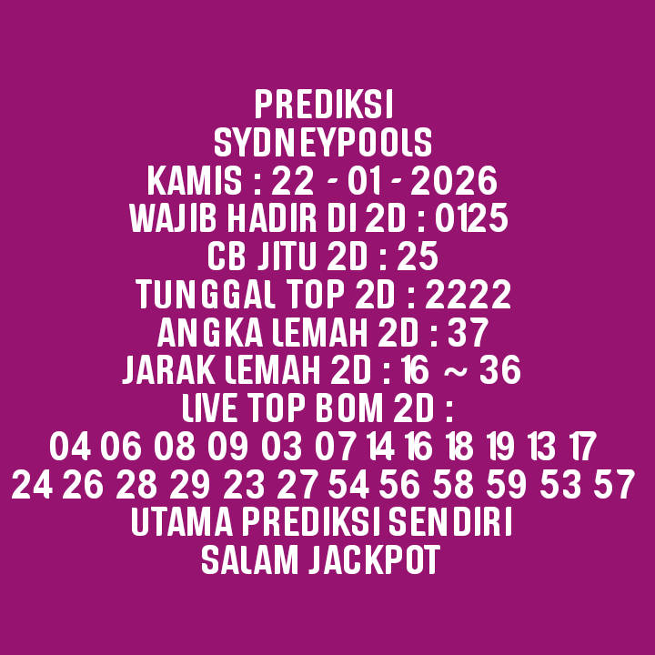 Prediksi Sydneypools Sabtu, 31-01-2026 Merupakan Prediksi Otomatis yang menggabungkan Metode Kalender Togel Dengan LN Generator yang akurasi prediksinya sudah kita ketahui bersama. Jadi harap Maklum Jika kadang meleset Prediksi Sydneypools kita. Jadikan ini sebagai perbandingan saja dan tetap Utamakan karya sendiri