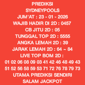 Prediksi Sydneypools Sabtu, 31-01-2026 Merupakan Prediksi Otomatis yang menggabungkan Metode Kalender Togel Dengan LN Generator yang akurasi prediksinya sudah kita ketahui bersama. Jadi harap Maklum Jika kadang meleset Prediksi Sydneypools kita. Jadikan ini sebagai perbandingan saja dan tetap Utamakan karya sendiri