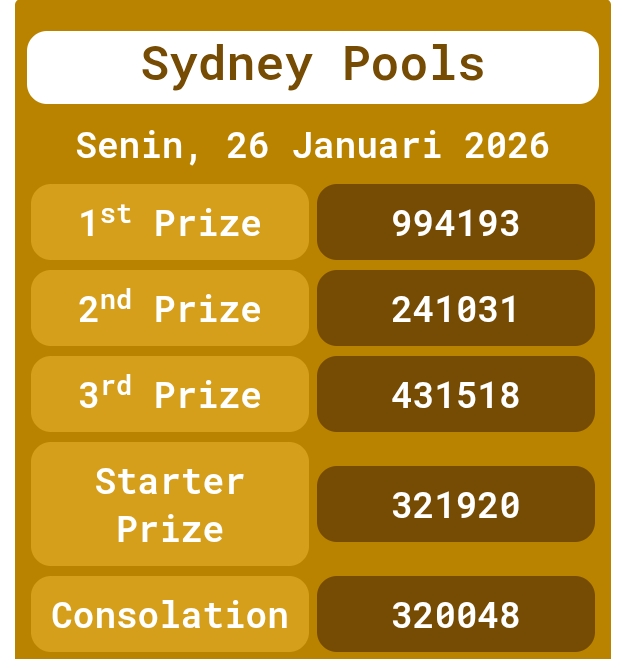 Prediksi Sydneypools Jumat, 30-01-2026 Merupakan Prediksi Otomatis yang menggabungkan Metode Kalender Togel Dengan LN Generator yang akurasi prediksinya sudah kita ketahui bersama. Jadi harap Maklum Jika kadang meleset Prediksi Sydneypools kita. Jadikan ini sebagai perbandingan saja dan tetap Utamakan karya sendiri