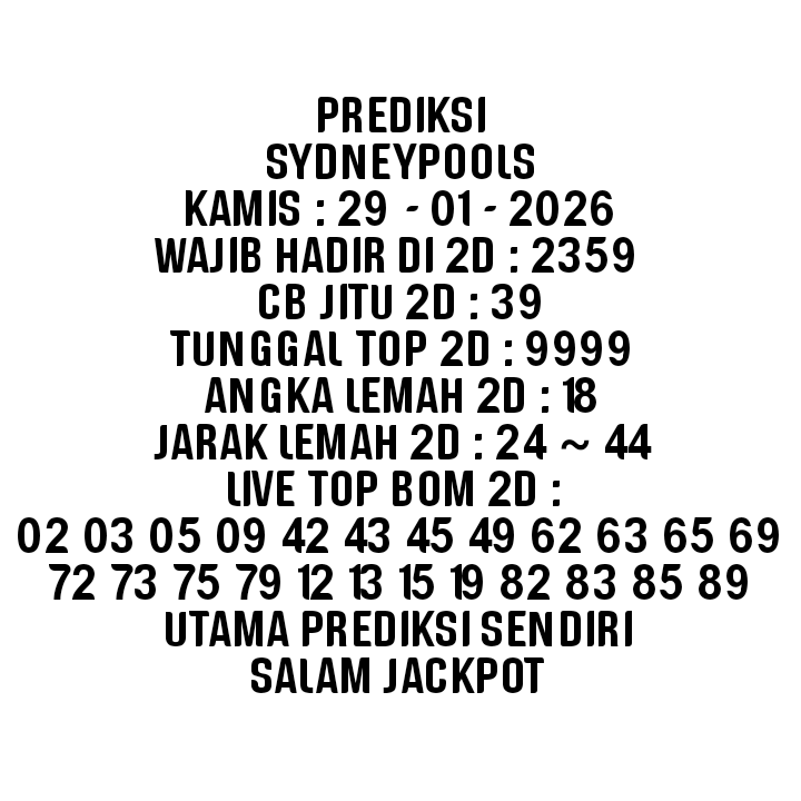 Prediksi Sydneypools Jumat, 30-01-2026 Merupakan Prediksi Otomatis yang menggabungkan Metode Kalender Togel Dengan LN Generator yang akurasi prediksinya sudah kita ketahui bersama. Jadi harap Maklum Jika kadang meleset Prediksi Sydneypools kita. Jadikan ini sebagai perbandingan saja dan tetap Utamakan karya sendiri