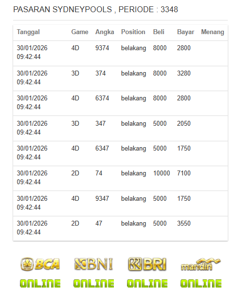 Prediksi Sydneypools Jumat, 30-01-2026 Merupakan Prediksi Otomatis yang menggabungkan Metode Kalender Togel Dengan LN Generator yang akurasi prediksinya sudah kita ketahui bersama. Jadi harap Maklum Jika kadang meleset Prediksi Sydneypools kita. Jadikan ini sebagai perbandingan saja dan tetap Utamakan karya sendiri