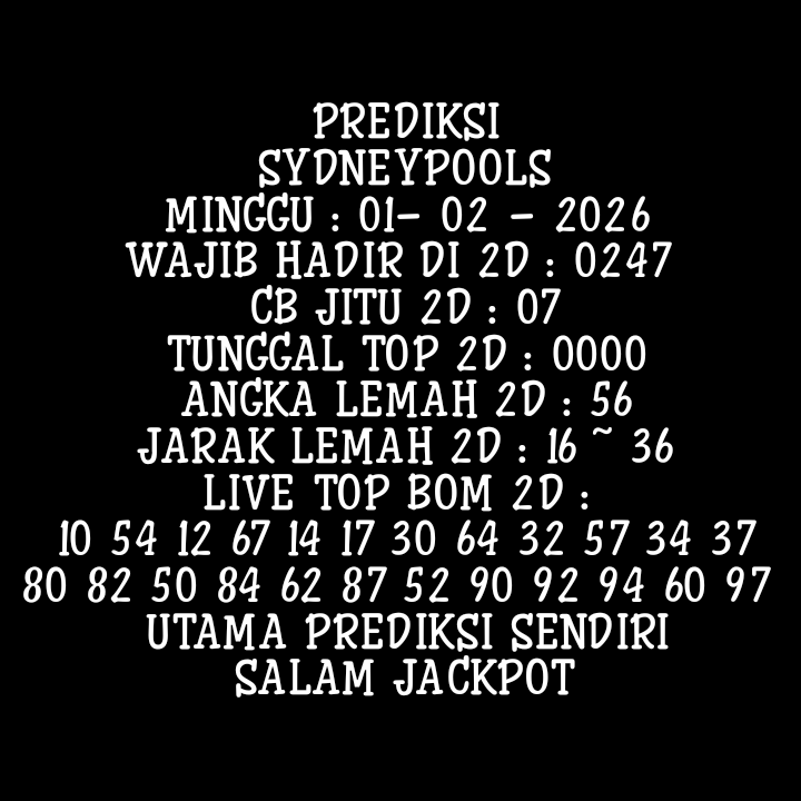 Prediksi Sydneypools Rabu, 28-01-2026 Merupakan Prediksi Otomatis yang menggabungkan Metode Kalender Togel Dengan LN Generator yang akurasi prediksinya sudah kita ketahui bersama. Jadi harap Maklum Jika kadang meleset Prediksi Sydneypools kita. Jadikan ini sebagai perbandingan saja dan tetap Utamakan karya sendiri