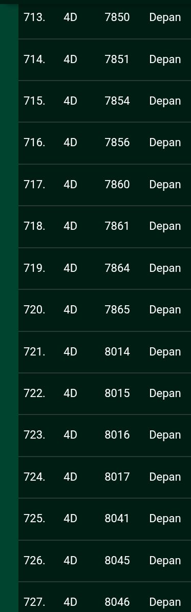 | Rumus Angka Mati berdasarkan kepala harian | 04 06 07 09 10 18 19 20 21 29 30 31 32 42 43 50 51 53 54 61 62 64 71 72 73 74 75 76 82 83 84 85 86 87 93 94 95 96 98 |