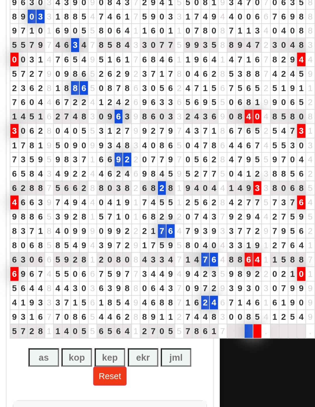 | Rumus Angka Mati berdasarkan kepala harian | 04 05 06 07 08 09 10 15 16 17 18 21 26 28 29 30 31 32 41 42 43 52 53 54 64 65 72 73 75 76 83 84 86 93 94 95 96 97 98 |