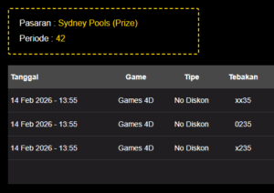 Prediksi Sydneypools Jumat, 06-02-2026 Merupakan Prediksi Otomatis yang menggabungkan Metode Kalender Togel Dengan LN Generator yang akurasi prediksinya sudah kita ketahui bersama. Jadi harap Maklum Jika kadang meleset Prediksi Sydneypools kita. Jadikan ini sebagai perbandingan saja dan tetap Utamakan karya sendiri