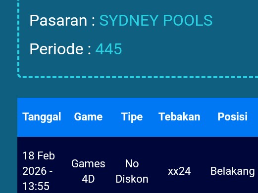 Prediksi Sydneypools Rabu, 04-02-2026 Merupakan Prediksi Otomatis yang menggabungkan Metode Kalender Togel Dengan LN Generator yang akurasi prediksinya sudah kita ketahui bersama. Jadi harap Maklum Jika kadang meleset Prediksi Sydneypools kita. Jadikan ini sebagai perbandingan saja dan tetap Utamakan karya sendiri