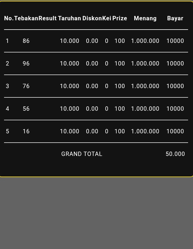 | Rumus Angka Mati berdasarkan kepala harian | 04 05 06 07 08 09 10 15 16 17 18 21 26 28 29 30 31 32 41 42 43 52 53 54 64 65 72 73 75 76 83 84 86 93 94 95 96 97 98 |