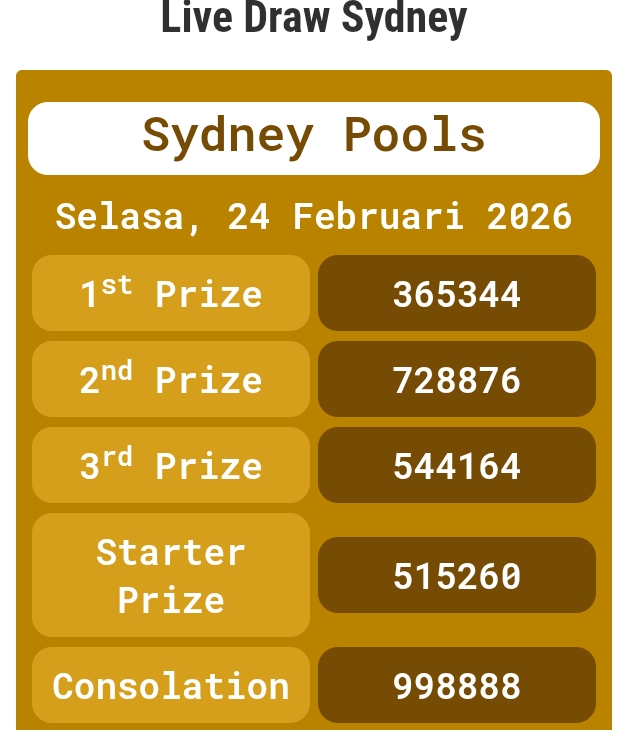 Prediksi Sydneypools Rabu, 25-02-2026 Merupakan Prediksi Otomatis yang menggabungkan Metode Kalender Togel Dengan LN Generator yang akurasi prediksinya sudah kita ketahui bersama. Jadi harap Maklum Jika kadang meleset Prediksi Sydneypools kita. Jadikan ini sebagai perbandingan saja dan tetap Utamakan karya sendiri