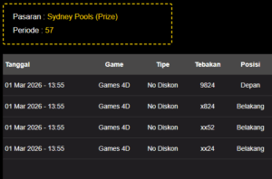 Prediksi Sydneypools Senin, 02-03-2026 Merupakan Prediksi Otomatis yang menggabungkan Metode Kalender Togel Dengan LN Generator yang akurasi prediksinya sudah kita ketahui bersama. Jadi harap Maklum Jika kadang meleset Prediksi Sydneypools kita. Jadikan ini sebagai perbandingan saja dan tetap Utamakan karya sendiri