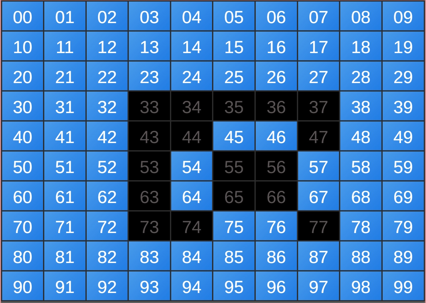 00*01*02*03*04*05*09*14*17*21*23*25*26*27*28*29*37*38*39*40*41*45*47*49*50*52*57*59*62*64*69*71*73*74*75*76*77*81*83*85*86*87*88*89*93*95*97*98*99*