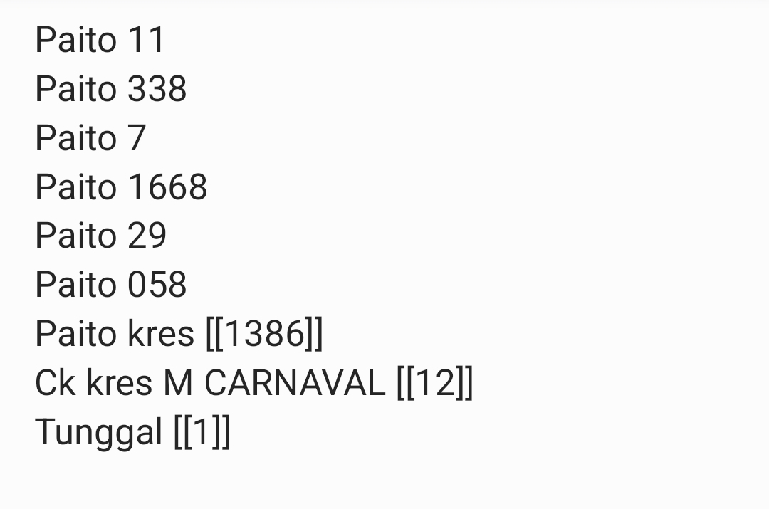 | Rumus Angka Mati berdasarkan kepala harian | 08 09 10 16 17 19 20 27 28 30 31 32 37 38 39 40 41 42 43 48 49 50 51 52 54 59 60 62 63 65 74 75 76 85 86 87 96 97 98 |