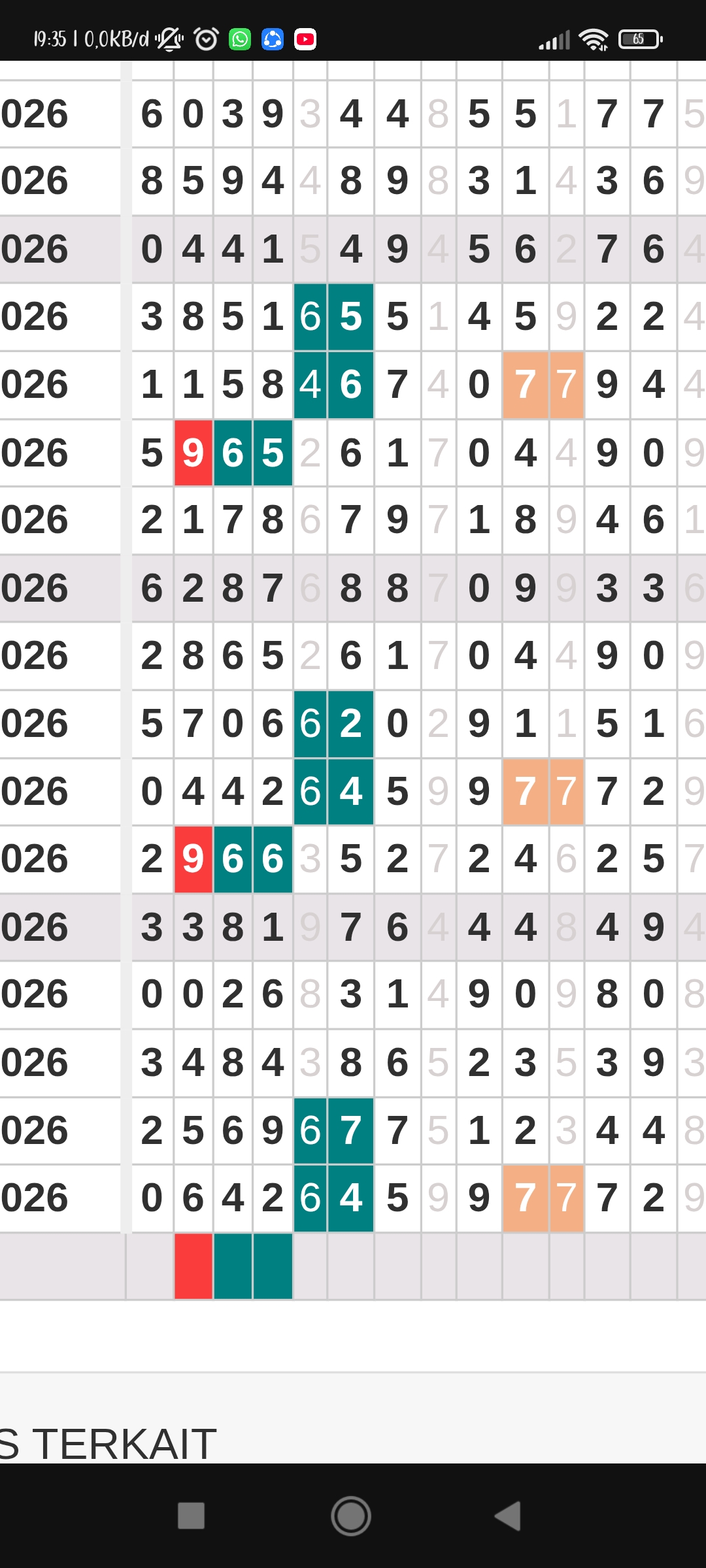 | Rumus Angka Mati berdasarkan kepala harian | 04 05 06 07 09 10 15 17 18 20 21 29 30 31 32 41 42 43 53 54 61 62 64 65 72 73 75 82 83 84 85 86 87 93 94 95 96 97 98 |