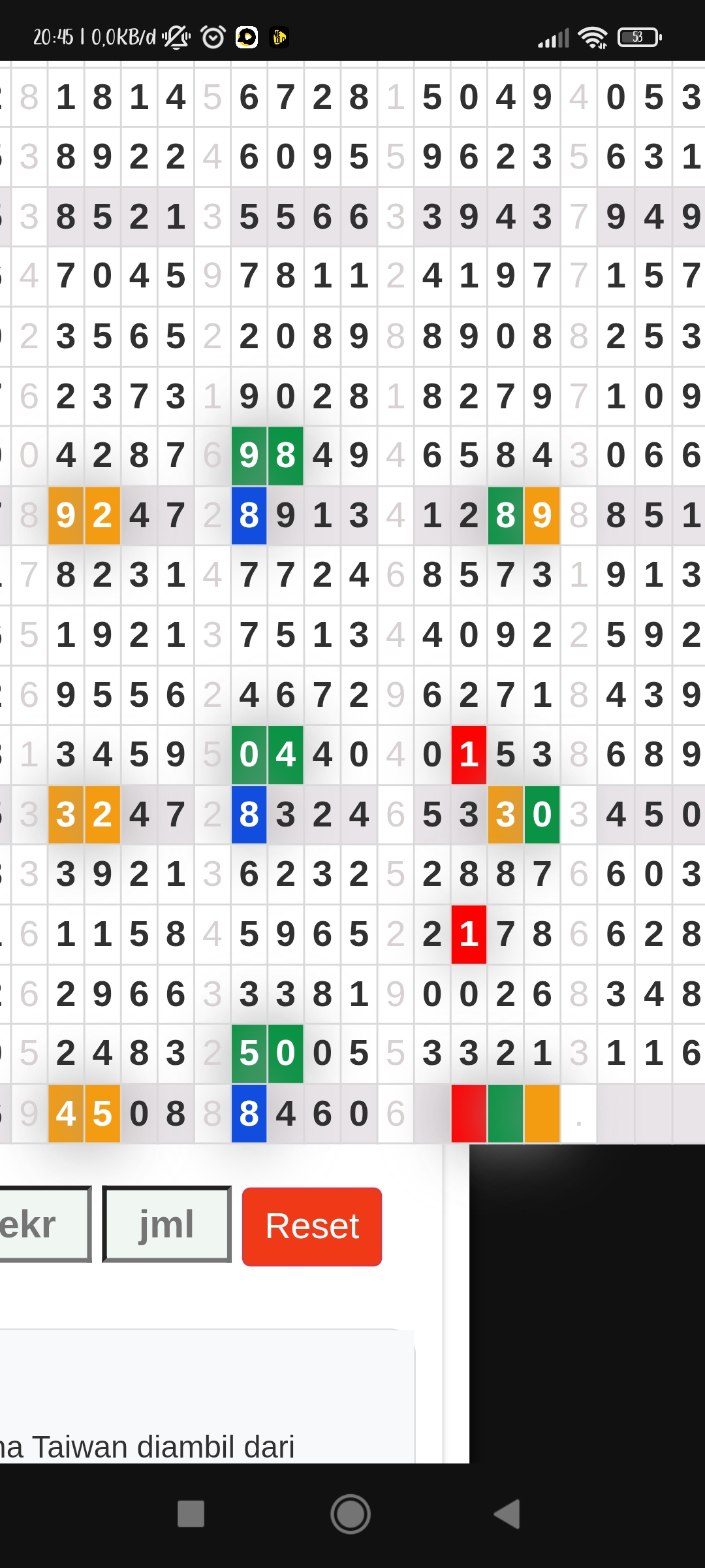 | Rumus Angka Mati berdasarkan kepala harian | 07 08 09 10 18 19 20 21 31 32 38 39 40 42 49 50 51 52 53 54 59 60 61 62 63 64 65 71 72 73 74 76 82 84 85 87 96 97 98 |