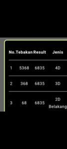 | Rumus Angka Mati berdasarkan kepala harian | 04 05 06 07 09 10 15 17 18 20 21 29 30 31 32 41 42 43 53 54 61 62 64 65 72 73 75 82 83 84 85 86 87 93 94 95 96 97 98 |